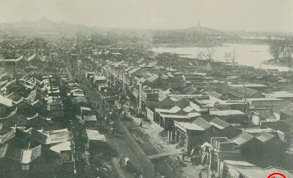 这个高处俯拍的是后门大街,也叫地安门大街,右侧屋脊连着屋脊,好多都是牌匾雪白字黑底的铺子,绸缎行门帘厚实,银号门口有铜狮子蹲着,爷爷说这里东富西贵交界,买卖做得体面,人往来稠得像过年。