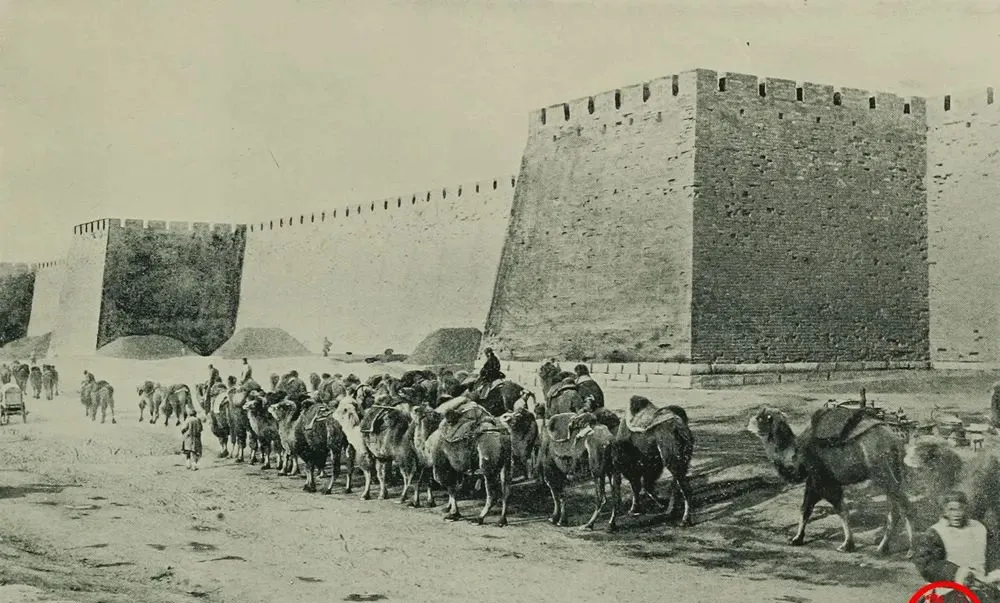 这串驼队贴着瓮城拐角走,驮的是皮口袋和木箱,辔头上挂铜铃,一摇就丁当脆响,领队的披羊皮坎肩,脚下毡靴厚得能挡风,奶奶说冬天北风削脸,只有骆驼不怕冷,踩雪也稳稳的。