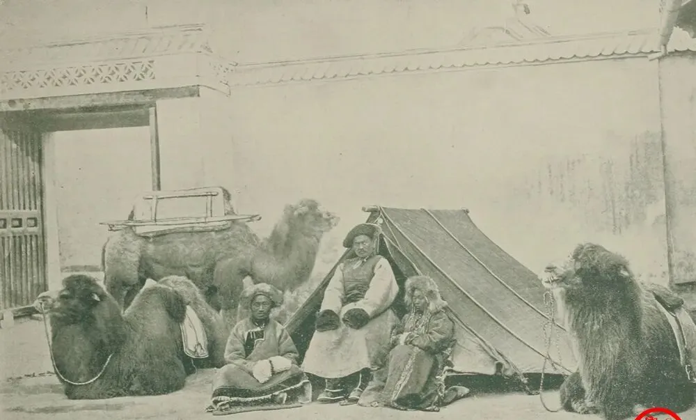 这个坐姿端正的一对,是留在京里的蒙古夫妇,男的戴皮边高帽,腰系宽布带,女的头饰一道一道垂到胸前,耳边坠子亮,袖口绒边厚,面相沉稳,看得出是做小买卖能讲价的主儿,镜头没收拾他们,他们自己就坐成了像样儿。