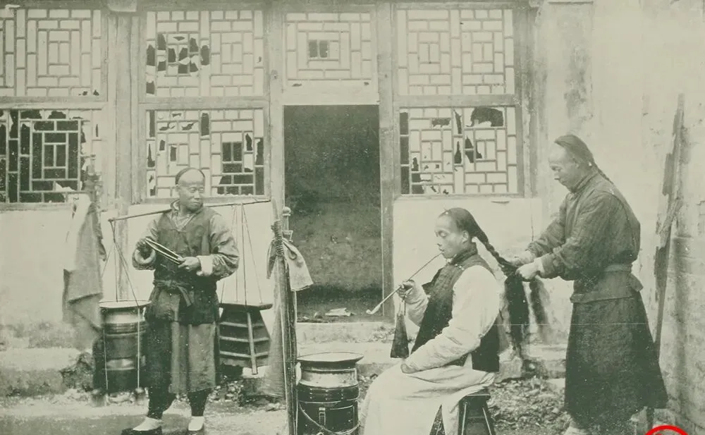 这个摆在窗下的就是剃头摊,木箱翻开就是案板,旁边那桶水里漂着刮刀和铜盆,师傅左手拢辫右手托刀,客人叼着长烟袋半闭眼,后面徒弟用风箱鼓着火热刮脸水,爸爸指着说,那时候理发是剃前额再梳辫子,不常洗头,赶上大集才整一回。