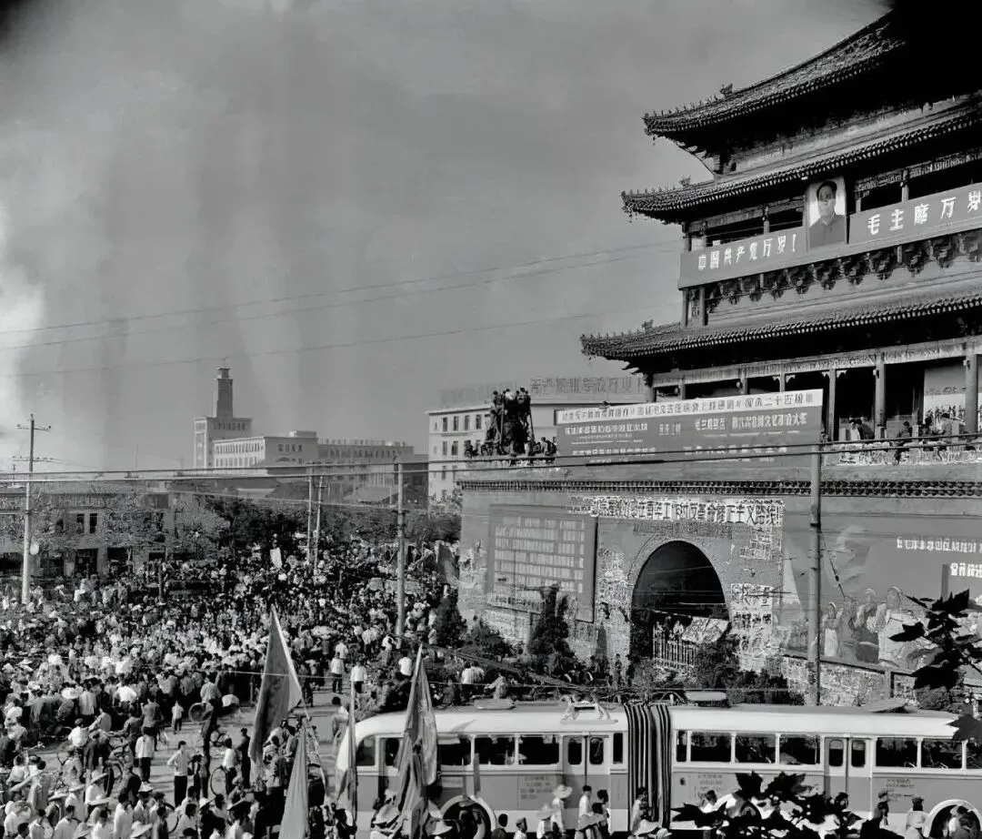 图里这阵仗叫热闹场面,旗子飘着,公交车贴着标语从人堆边慢悠悠过,城楼上悬着大标幅,黑白影像都挡不住那股子劲头,奶奶说那天人多得挤不动脚,回家鞋帮都挤变了形。