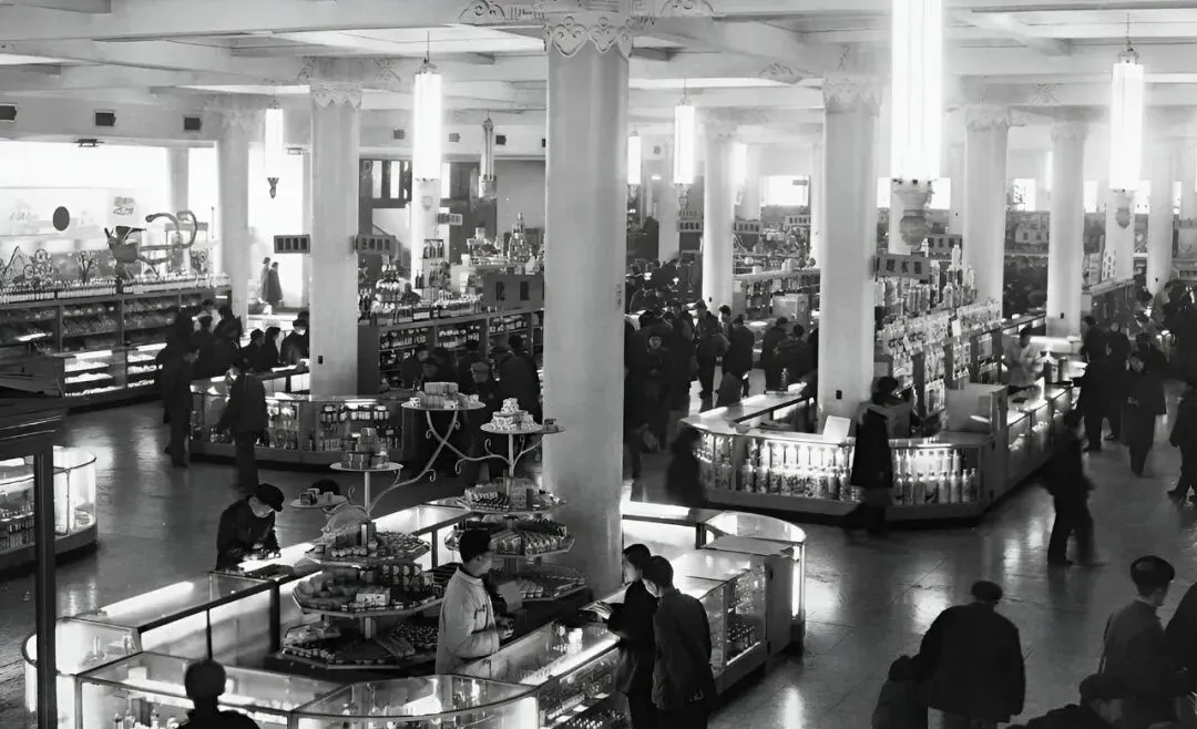 图中这一溜儿玻璃台面叫百货柜台,柱子直挺挺立着,灯管亮得晃眼,糖果瓶、搪瓷缸、香皂堆成小塔,售货员戴袖套,算盘啪啪打得飞快,以前想买点啥得先问有票没,现在手机一点,快递就上门了。