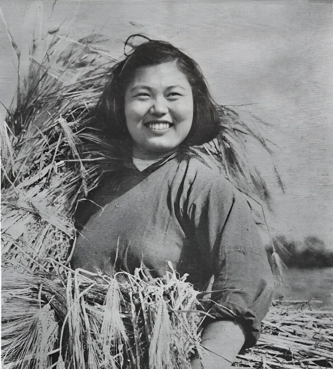 这位女社员肩上挑的叫麦捆,粗糙的秸秆擦着衣袖,风一来,鬓角全被吹乱了,她却笑得敞亮,爷爷说收麦子最讲究手快利索,捆扎要绷紧,不然一抬就散。