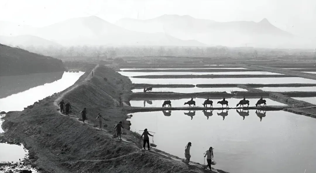 这条窄埂子两边是秧田,牛在水面投下黑影,挑担的人走在前头,肩膀被扁担磨出一条亮印,小时候我沿着埂子跑,鞋一歪就扎进泥里,拔出来咕嘟一声响。