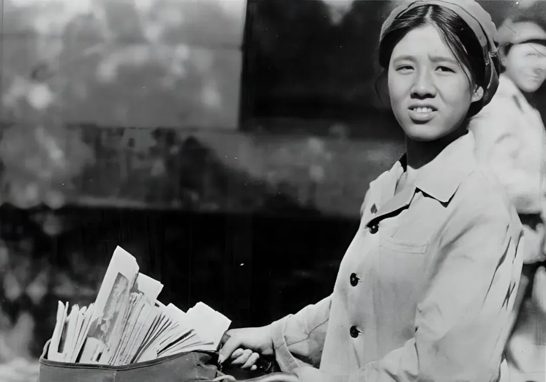 这个帆布口袋叫邮袋,信件杂志塞得鼓鼓的,姑娘推着车,扣子系到了最上面一粒,眉头被太阳晒得微微皱,她一边问路一边翻分拣单,嘴里还念着门牌号。