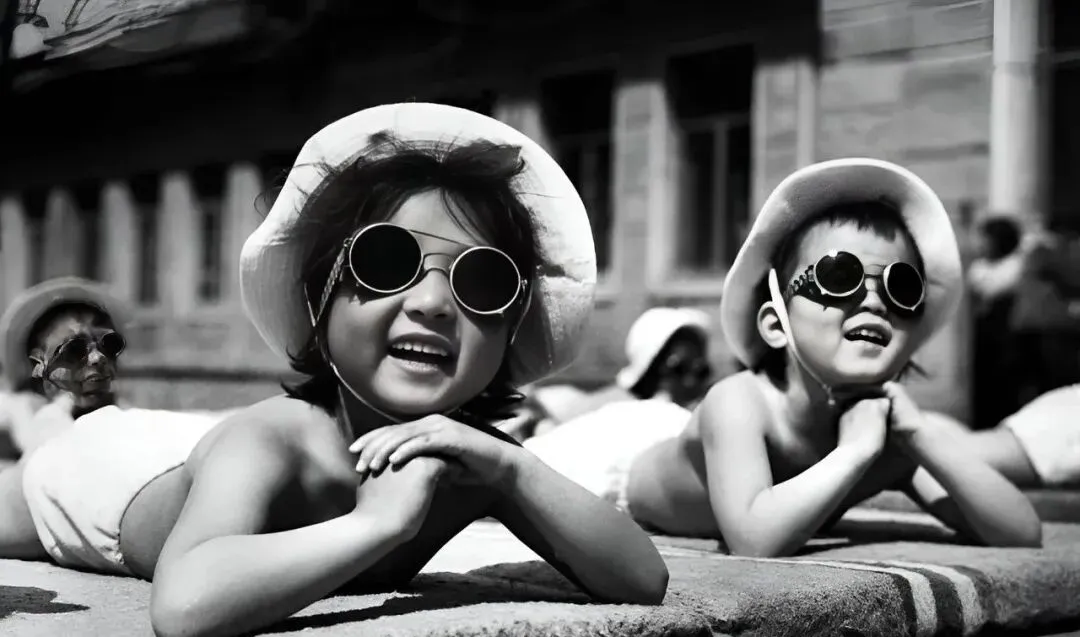 图里这墨镜圆滚滚的,边上还拴着细皮筋,白布帽压着头发,小胳膊肘撑在毛巾上,奶奶说那会儿讲究晒太阳补钙,孩子们一趴一大片,笑得露出缺了口的小门牙。