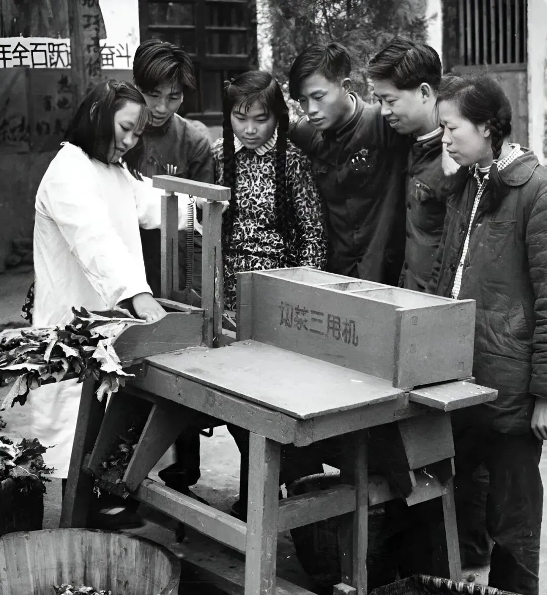 这个木台子叫切菜三用机,弹簧立在侧边,拉杆一按刀片就下去,围着的人把头探得老近,技术员一边比划一边叮嘱别伸手,妈妈说那会儿谁家有个省力的小器具,邻居都来借着试。