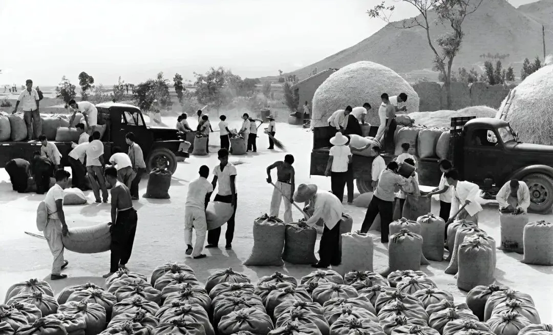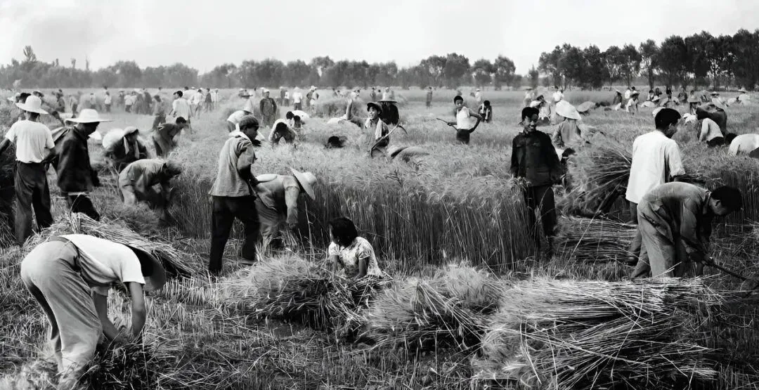 这一地麦把子堆得像小山,镰刀一片片晃银光,社员们弯腰抬手,捆扎、拉运、装堆一气呵成,汗顺着脖梗子往下淌,口袋里塞着凉馍一口一口地啃。