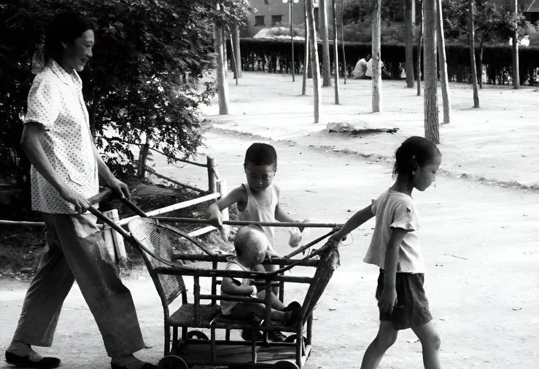这车身是竹木拼的,四个小铁轮吱嘎吱嘎响,姐姐在前头拽,妈妈在后头提着网兜护着,娃坐在栏杆里两只脚晃啊晃,路边土扬起来,落在小胳膊上痒痒的。