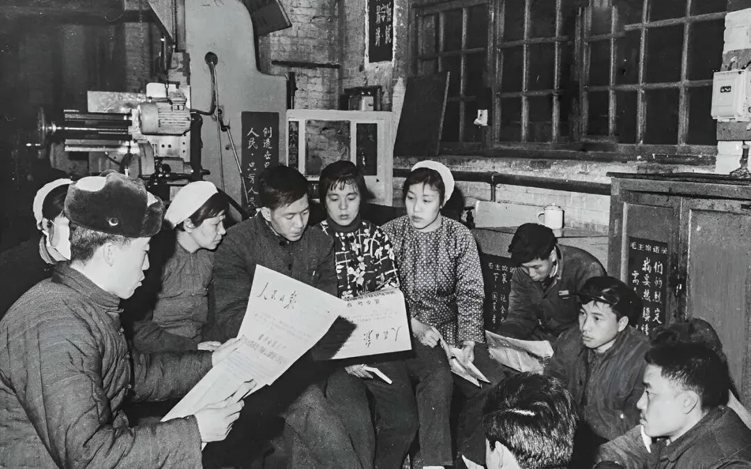 这份纸叫《人民日报》,几个人围着凳子坐一圈,冷风从窗缝里钻进来,围巾紧了紧,谁读到关键处就抬头解释两句,墙上黑板写着标语,粉笔末落一地。