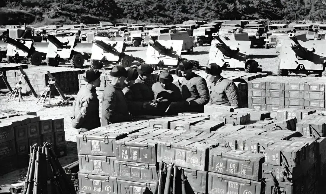 图中一摞摞的是弹药箱,白字黑漆标得清清楚楚,战士们围成小圈核对登记,帽檐压得低低的,地面踩得硬邦邦,队列远处像一排排黑色砖头。