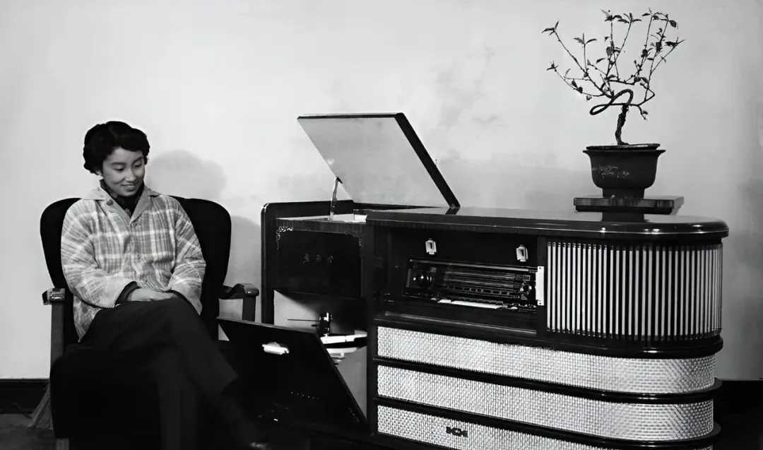 这个大件儿叫组合音响,右边是收音机刻度尺,左边能掀开放唱片,面板是细条纹铝网,开关“咔哒”一按就亮,妈妈说那会儿播一曲越剧,邻居都来凑,茶缸排成一排。