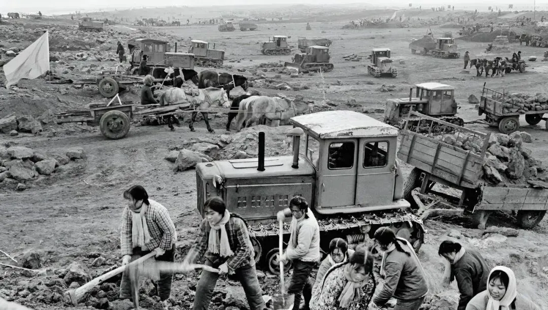 这车叫履带拖拉机,铁链子咔嚓咔嚓碾在石头上,知青们扛着铁锹一条线排开,旗子在土坡上鼓得猎猎响,晚上回到窝棚里,手掌心全磨起了泡。
