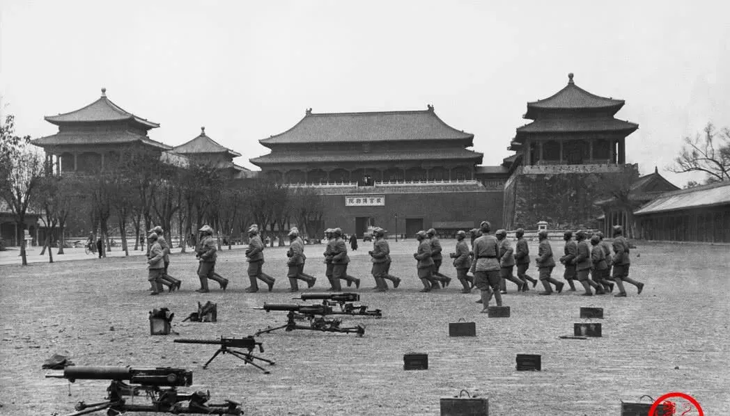 图中这一地的轻重机枪和弹药箱,叫作箱式弹链机枪和三脚架机枪,黑黝黝的钢身在冬日里发灰光,一字儿摆开,前面是正步跑圈的新兵队列,棉军装鼓鼓囊囊,腰间绑着布带,口号喊得哑,回声却被宫墙吞了去,爷爷说那会儿征来的壮丁多,脚上草鞋还没磨顺就得上场训练,手一摸冰冷的枪身,心里发怵也不敢说。