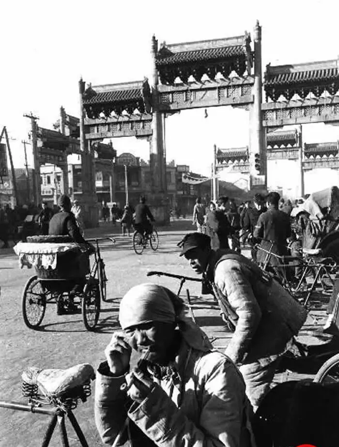 这处大牌坊我们那时叫正阳门外牌楼,街口最热闹,黄包车、脚踏车、肩挑担互相让路,一位车夫用破棉围巾裹着头,牙齿叼着旱烟袋锅,眯眼看天,像在盘算下一单活儿的价钱,牌坊影子一晃过去,日子也就这么晃过去了。