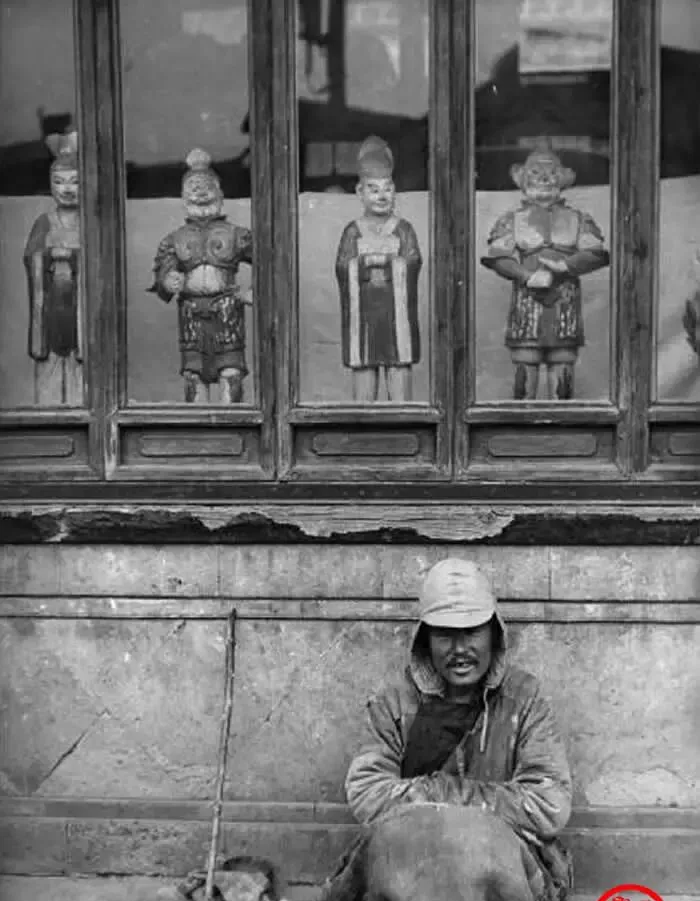 这个木头彩绘的叫泥金木偶神像,站在玻璃后面,身披甲胄,神情威严,玻璃外墙根蜷着的,是裘衣打着补丁的汉子,怀里一个布口袋空空如也,他身旁那根细竹竿是讨口棍,轻轻一敲石阶,铿的一声,回响冷到骨头缝里。