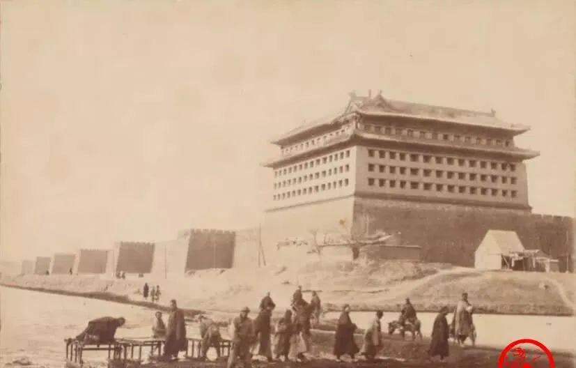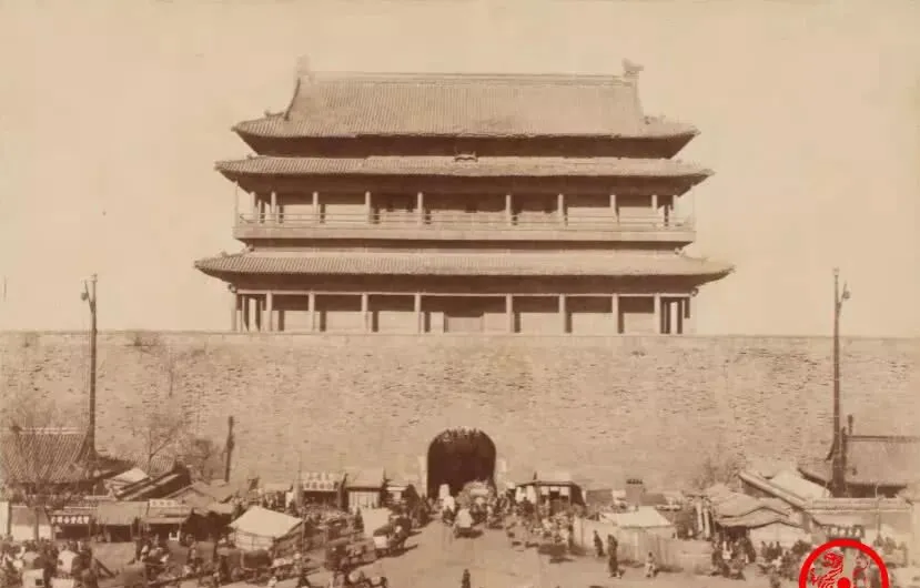 图中高大的楼叫前门箭楼,灰砖砌成的城台厚得跟山一样,城洞子黑漆漆的,车马人流从里头穿过去,楼檐是重檐歇山,瓦面压得稳稳当当,城门两旁摆着小摊子,糖葫芦的红旗子在风里抖,听老人说,进城做买卖的都爱从这口进,热闹归热闹,守门的兵也不含糊,夜里一落锁,谁也别想混进去。