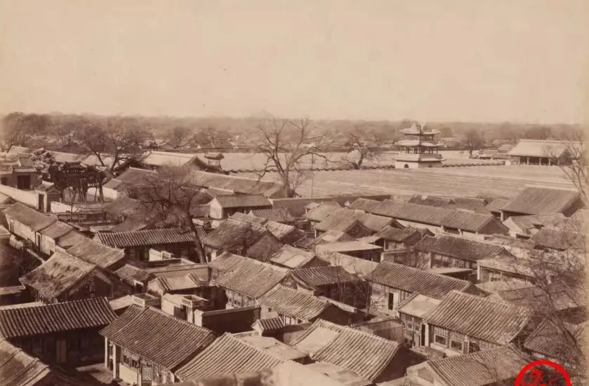 这片连成片的房顶是胡同人家的屋脊,灰瓦老檐,树杈子从院子里探出来,远处露出一截牌楼的角,院里做饭的烟往天上一冒,邻居递个葱头从墙头就过去了,小时候我在南城住过几年,中午敲铁盆卖馄饨的一响,整条胡同都活了,现在楼里住着,门对门的人都叫不出名。