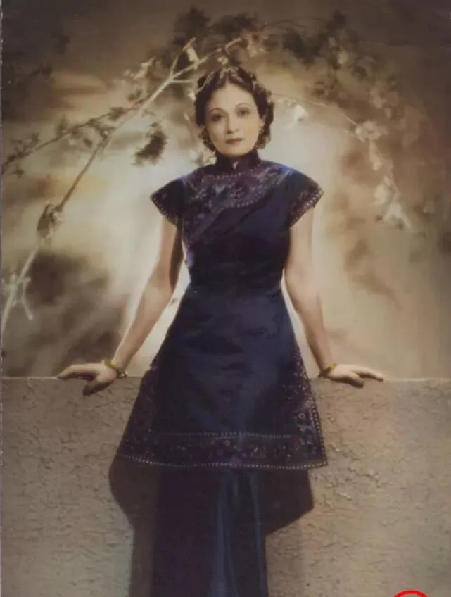 这张里是海军蓝珠片礼服,上身短袖立领,下摆分层叠着亮丝边,她双手扶着栏台,背后是画出来的枝蔓背景,老照相馆就爱用手绘景,既体面又省心,摄影师会说,抬一点下巴,收一点肩,这样看着精神,成片出来,家里人都要围着夸一圈。