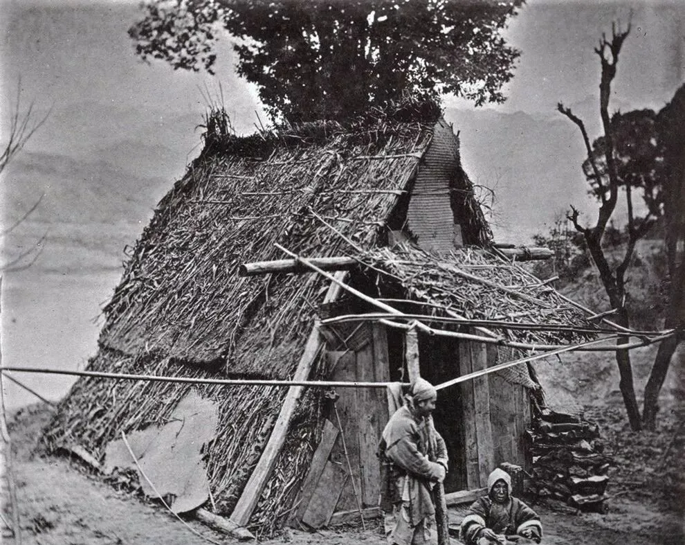 这座歪歪斜斜的屋叫草棚,屋脊是秫秸压泥,檐下横一根竹竿晾衣裳用,门口两人一个站一个蹲,脚边小土台当台阶,墙上补丁似的泥巴一块块抹的,风从山口钻过来,屋里点个小火塘才暖和点儿,以前住屋讲究能遮风避雨就行,现在讲采光保温隔音,差得不是一星半点。