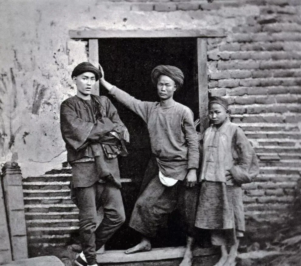 这组三人合影里,两个包着头巾,一个少年还穿着打补丁的短褂,躯干挺直,手搭门框,脚下一只布鞋一只草鞋,站姿带点倔强,这种包头巾在当地是苦力的标记,干码头、抬大轿、推石碾都用,汗水顺着鬓角淌下来,被布一裹,不眯眼不打滑,简单又实用。