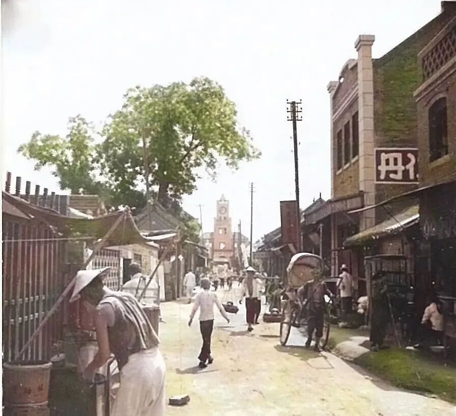 潍县的街市,远处是潍县钟楼