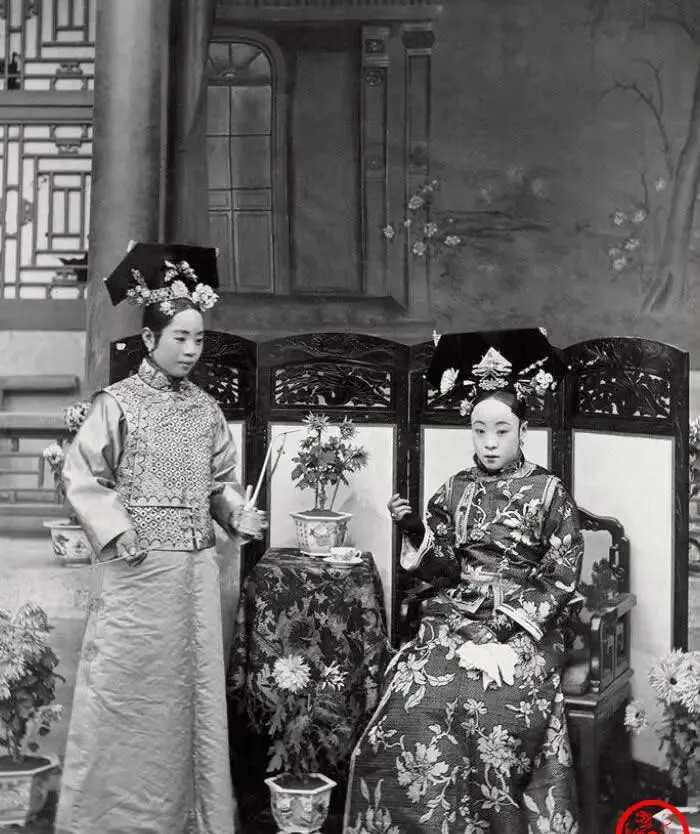 这个场景叫内宅雅集更贴切,坐着那位穿大团花缎袍的,是当家的主位,手里端着烟杆,屏风后是画景楼阁,站在一旁的年轻人身着绣坎肩,襟口与袖口压着细细的滚边,整个人是清清秀秀的样子,发饰压得稳,花叶叠得实,这类摆拍讲究的是“静”,一动不动,却把气派定住了。