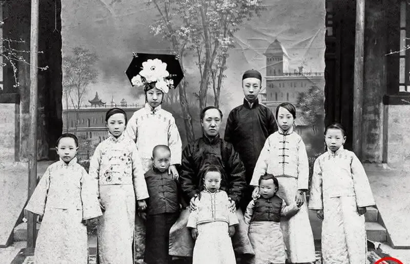 这个大合影更像“到此一照”,图中中间的男人神情内敛,左右是一群姊妹兄弟,头饰上那朵大绒花份量很足,像一团白云栖在发冠边,后面的布景画上还有城楼与洋楼并立,老法师喜欢这招,一下把“旧礼”与“新景”叠在一块儿,那时候家里也在变,衣服还是绸缎长衫,心里已经掺进了洋式的算盘。
