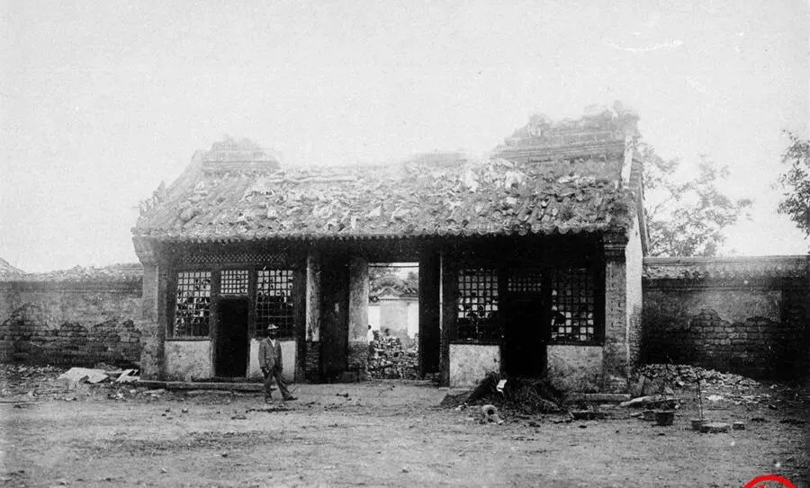 图中这一座残破的牌楼门就是肃亲王府的大门,顶上琉璃瓦被炸得七零八落,门洞里堆着碎砖和木梁,门前只站着一个人,显得空落落的,按老规矩这门口原该悬着匾额挂着门灯,仪门内还得摆上银安殿的中轴气派,可眼下只剩一地狼藉了。