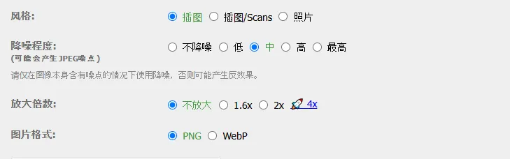 注意限制:上传图≤5MB;降噪处理的图≤3000×3000像素,放大的≤1500×1500像素。输出可选PNG或WebP,满足不同场景。