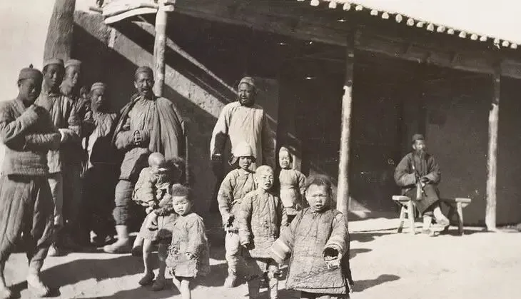 这一家子门前站成一排,小娃穿棉袄肘处鼓鼓的,这是打补钉的褶儿,大人蹲在台阶上抠烟锅,老太太把门帘一掀一放,土院子里晒着半担谷糠,小时候我见过类似的院子,进门先闻见土腥味,再是灶台上热气腾腾的糊糊香。