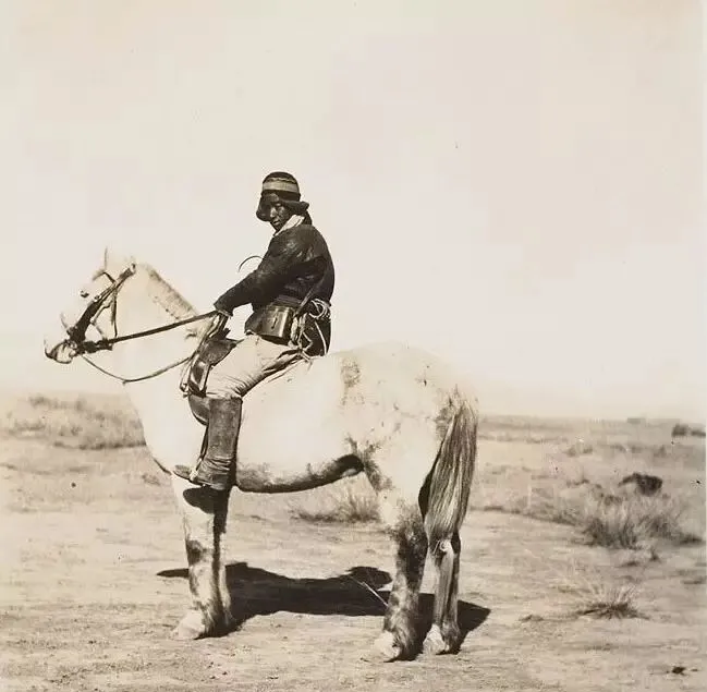 这位骑在马上的是押队的护送人,厚毡帽子护住耳朵,腰间一圈革带拴着干粮袋和火镰,马是矮壮的河西小高头,耐走不挑食,一天能赶七八十里路,现在坐车一小时就过的路,以前得靠它慢慢蹚。