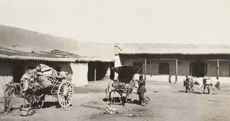 这一圈房子是路店客栈,车马在当院一停,伙计抄起水桶去给牲口饮水,屋檐下吊着风干的肉条,墙根堆着麻袋,掌柜坐在柜台后抄账,黑灯下火的夜里,听见院外风沙拍墙的响,困的人一下清醒了。