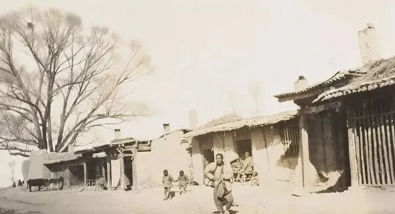 这一排临街土屋,屋顶压着柴草和土块,这是防风压顶的做法,门前有人蹲着缝鞋底,有人抱着孩子晒太阳,远处一棵老槐树把影子落在墙上,冬天的光薄得像纸,晃一下就碎了。