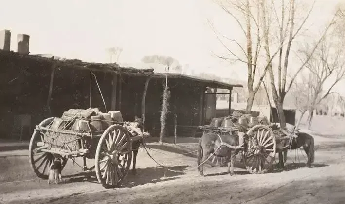 这两辆满载的大车是行旅车队,车帮外用绳网箍着坛坛罐罐,旁边两匹骡子低头喘着白气,车前绑着一束艾草,图个路上不招晦气,爷爷说走商的讲“先稳后快”,车不翻,比啥都强。