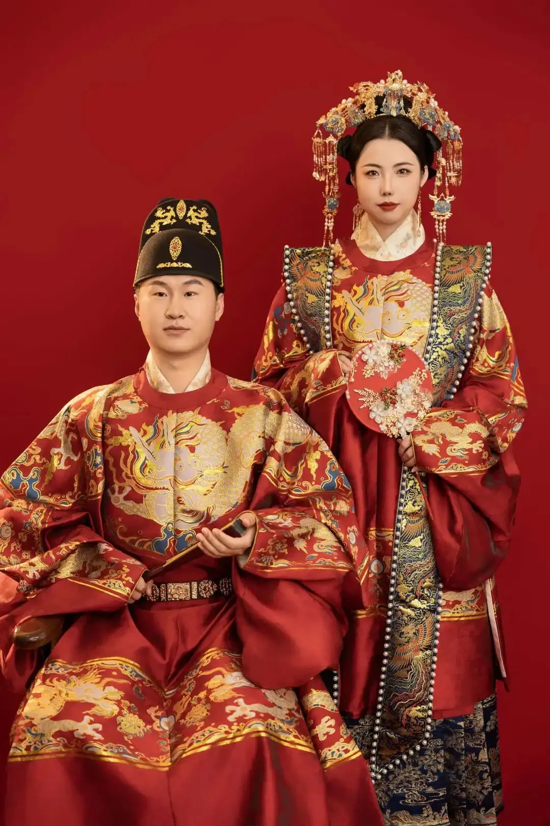 王彦东:这组明制婚服写真,是我们对传统婚仪的致敬。没有西式婚纱的浪漫,却有凤冠霞帔的庄重。一针一线的织金纹样,一颦一笑的坚定眼神,都在诉说:爱不仅是当下的誓言,更是对千年浪漫的传承。