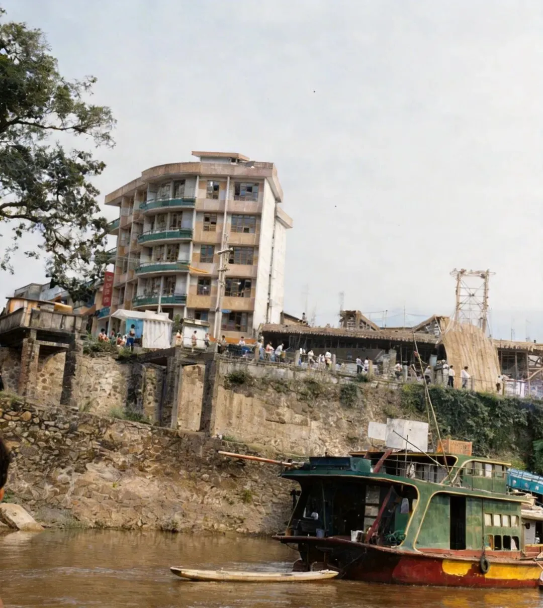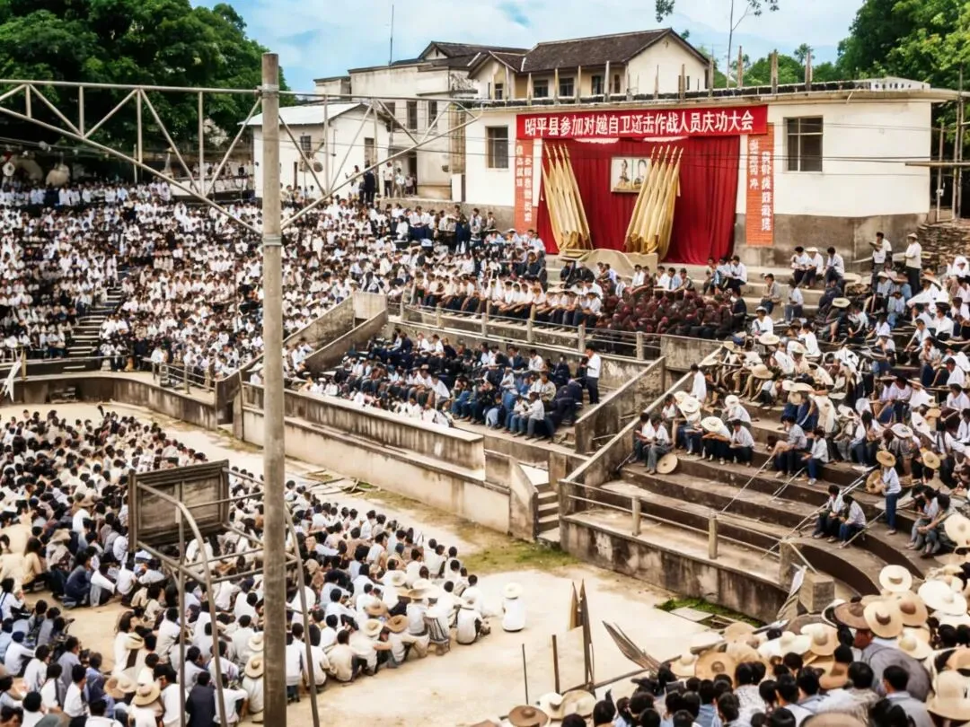 门上的这些字原照片里非常模糊了,只有跃进门三个字比较清楚,后面这些字是我查了一些资料后修补上去的,应该大差不差的。。昔日的昭平县松林峡铁索桥,听说这个铁锁的当年可是个热门“打卡点”。八十年代的昭平县灯光球场,这张照片上色后效果不好,后面补上原图↓昔日的昭平县灯光球场,跟上面的图片应该是同一个地方吧↓黄姚镇地处昭平县、钟山县、贺州市交界点,1984年撤黄姚公社为黄姚镇和巩桥乡,2005年巩桥乡并入黄姚镇。黄姚古镇位于广西贺州市昭平县东北部,是国家5A级景区(2022年获评),核心景区面积3.2平方千米,属喀斯特峰丛地貌,姚江等河流穿镇而过 。 历史沿革:发祥于宋代,兴于明万历,盛于清乾隆;因黄、姚两姓聚居得名,距今近千年。抗战时期曾是中共广西省工委驻地,留下诸多革命史迹。 核心景观:保存300多座明清古建筑、15座古桥(如标志性的带龙桥)、古戏台、兴宁庙、仙人古井、龙爪榕;青石板街巷纵横,“骑楼+天井”格局典型,排水系统精巧。 民俗与特产:汉、壮、瑶多民族融合,节庆有祭祖、三月三活动;黄姚豆豉为自治区级非遗,古法工艺传承数百年;也是《面纱》《茶是故乡浓》等影视取景地。昭平中学简陋的“足球场”,这张照片一开始我还以为是跳高的场景呢!修复后惊讶的发现是足球场的球门。比我们当年踢球时用两块石头当球门强不少↓同上,年代不同,这个应该比较新一些,喷泉应该失去功能了↓昭平隶属广西贺州市,地处桂江中游,是一座藏在青山绿水间的生态名城,素有“山清水秀生态美,镇古茶香人长寿”的美誉,更被称作“遗落在珠江上游的香格里拉”。