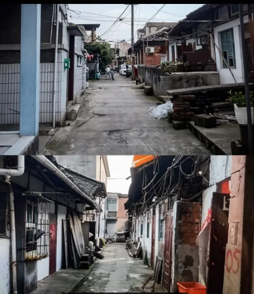 曾经的西街花园圃弄!巷子窄窄的,砖墙带着裂缝,木门旧得发黑,窗框也磨得发亮。头顶上,电线东一道西一道挂着,像是岁月织成的蜘蛛网。地上那水泥路,坑坑洼洼的,哪块砖松了、哪处有个浅水窝,小时候闭着眼都摸得门清。墙角永远堆着东西——几个腌菜坛子,一把散了架的破竹椅……石阶边那盆花年年自己开,晾衣绳在风里轻轻晃着。