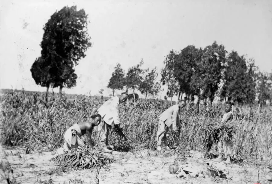 图中弯着腰的一溜人叫庄稼汉,手里抓着的是刚薅下来的谷穗或豆秧,薄衫被汗黏在背上,脚下是被镰刀割出的一行行茬口,风一吹就有土腥味往鼻子里钻,爷爷说那会儿天蒙蒙亮就下地,日头落山才收工,现在一台联合收割机一小时就顶过去一村人力气。