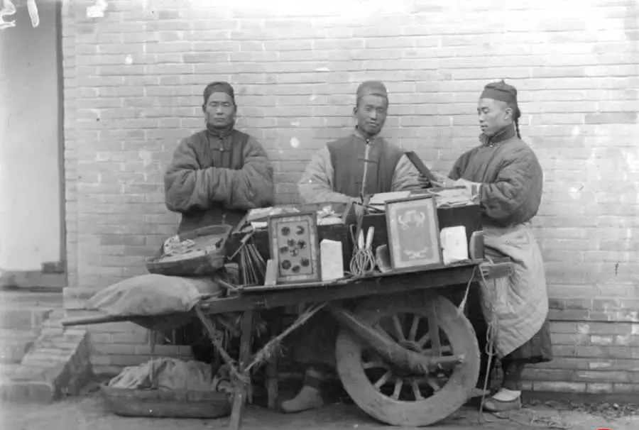 这个木架子上堆满小件儿的叫独轮车杂货铺,剪刀梳子镜框香粉盒子摆得满满当当,车把上还吊着一串麻绳和小铜锁,伙计们把袖子一撸就吆喝,娘那会儿爱在摊上挑针线包,说耐用不贵,放到现在电商一键下单,哪还用推着一车货村村转悠。