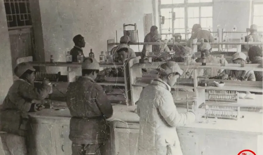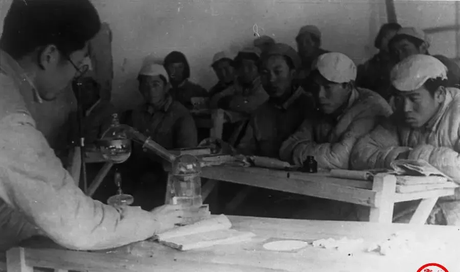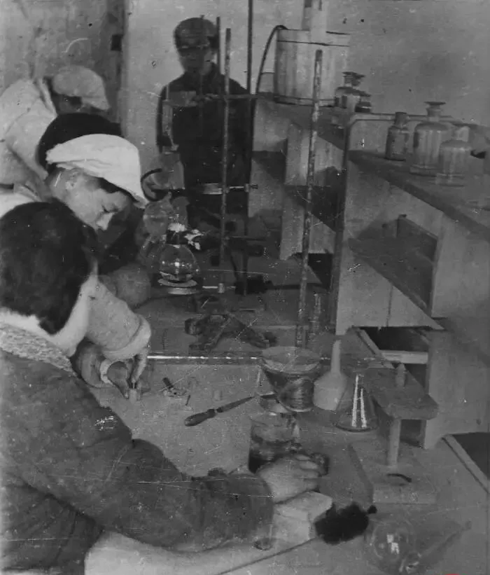 这块木台就是化学操作台,支架歪着也能夹住烧瓶,滴斗边上摆着漏斗和胶皮管,玻璃器皿不成套,瓶塞有木的也有软木的,水不热,手却忙,谁都不嫌挤,肩碰肩地让一让,实验做不完就把窗纸揭开透口风,夜里再接着配溶液。