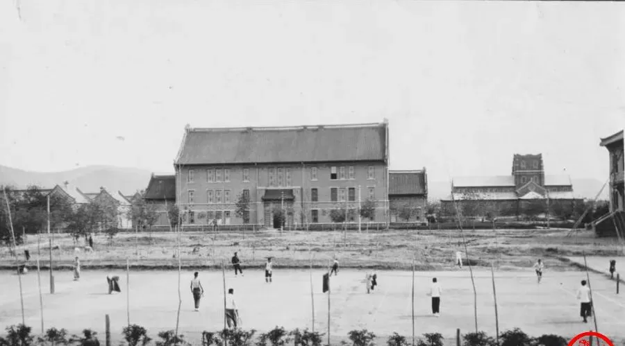 图中这片大院子叫操场,前头的大屋子是礼堂兼教学楼,红砖灰瓦,屋脊挑起两道利索的线条,远处还能瞥见钟楼的影子,学生们在地上拉了排球网和标线,衣摆一晃一晃,站位还挺讲究,我外公说他念书那会儿也这么玩,吹口哨就能把一队人招齐,没扩音器照样热闹。