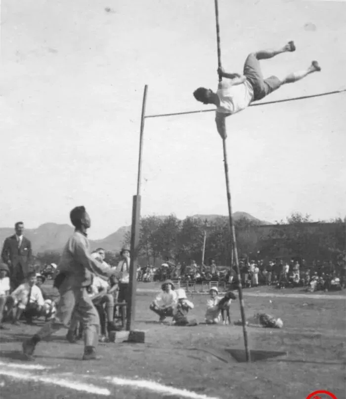 图中这简陋的装置叫跳高架,竹竿细长,落点就是地上的沙坑窝,裁判扛着旗,旁边同学蹲着捏汗,起跳的同学脚背一挑,人“刷”地翻过去,空中还来个小摆腿,我爸看见这张照笑说,那会儿没有玻璃纤维杆,没有海绵垫,也敢往上蹿,年轻就是胆大心细。
