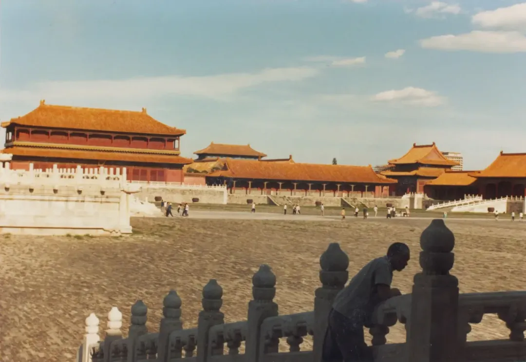 1980年,北京故宫内的游客,当时这里游客不算多。在蓝天白云衬托下的故宫气势恢宏,边上汉白玉栏杆上,一位大爷正趴在上面,不知道他这是在休息还是在思考人生?