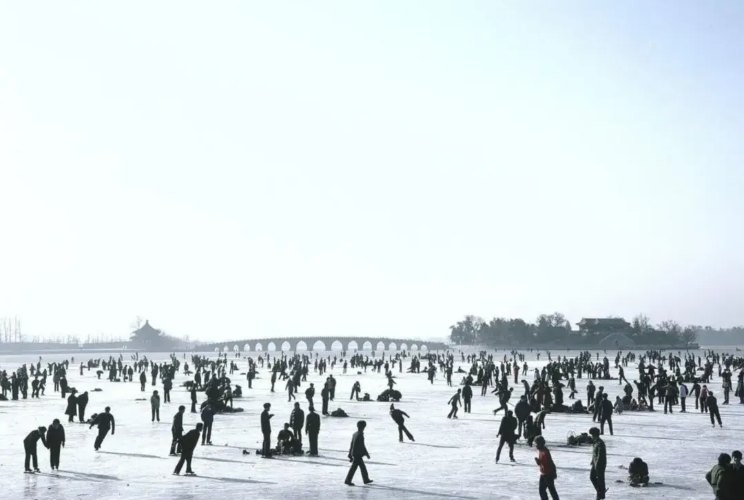 北京,冬季颐和园冰面上玩耍的人们。远处的十七孔桥和廓如亭清晰可见。