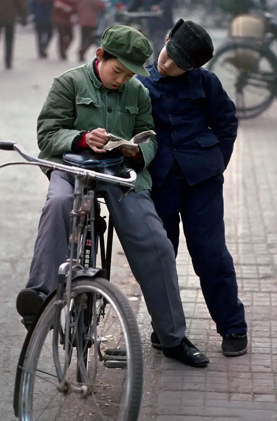 1984年的北京街头,两个在路边看小人书的少年。他们看得如痴如醉,丝毫没有注意到有人给他们拍了这张珍贵的照片。坐在自行车后座上的少年,穿着很是老成,西裤配皮鞋,边上站着的少年,这属于蹭书看。