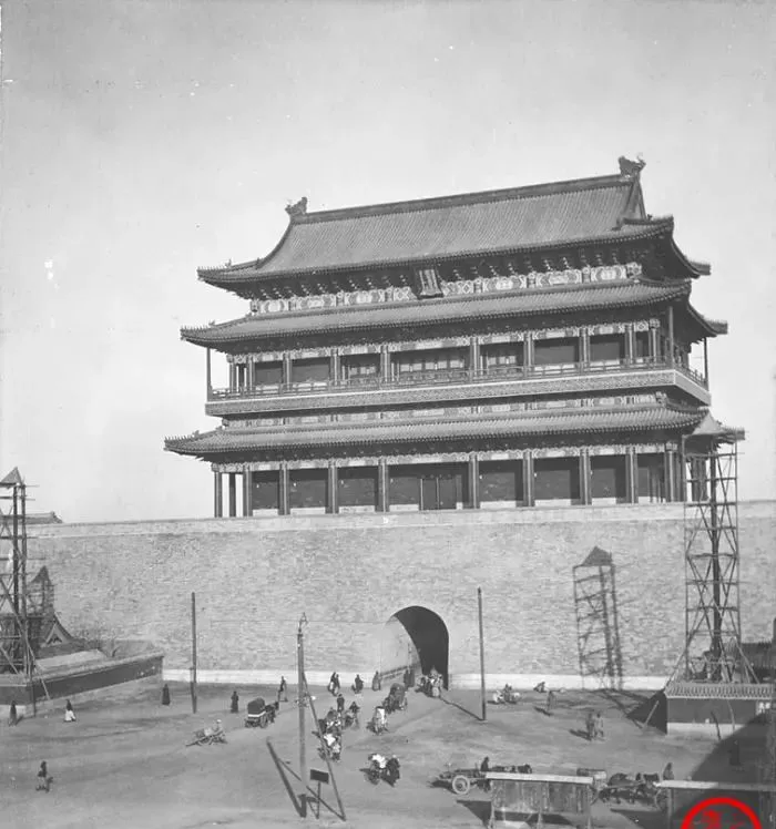 这个巍峨的大楼叫前门,内城九门之一,箭楼城楼并立成双,庚子年里吃了场火,后来重修才又立起来,楼檐层层压着,斗拱挤得满满当当,城洞下人力车、牲口车都能过,照片里脚手架还在,像给大个子披的木甲,爸爸看见这张笑道,这就是老北京的正面照,现在地铁从地下穿过去,城楼依旧端着架子,城门换了来往的脚步声。