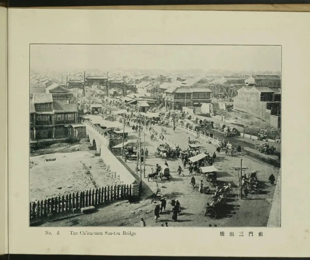 石桥是连接内城和外城的重要通道,是前门大街的起始点。照片里桥上人多车马喧闹,桥下护城河干涸且有大片空地。