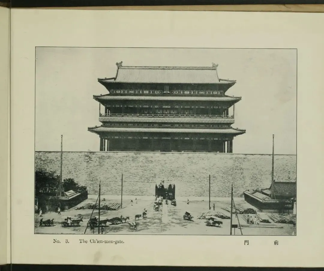 正阳门俗称前门,是北京内城的正门。照片中城楼有三层重檐歇山顶,气势颇为宏大。城门洞下马车和行人有序地通过,城墙上有木材似乎是用于修缮。