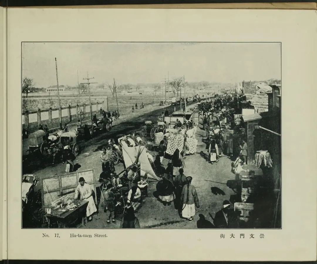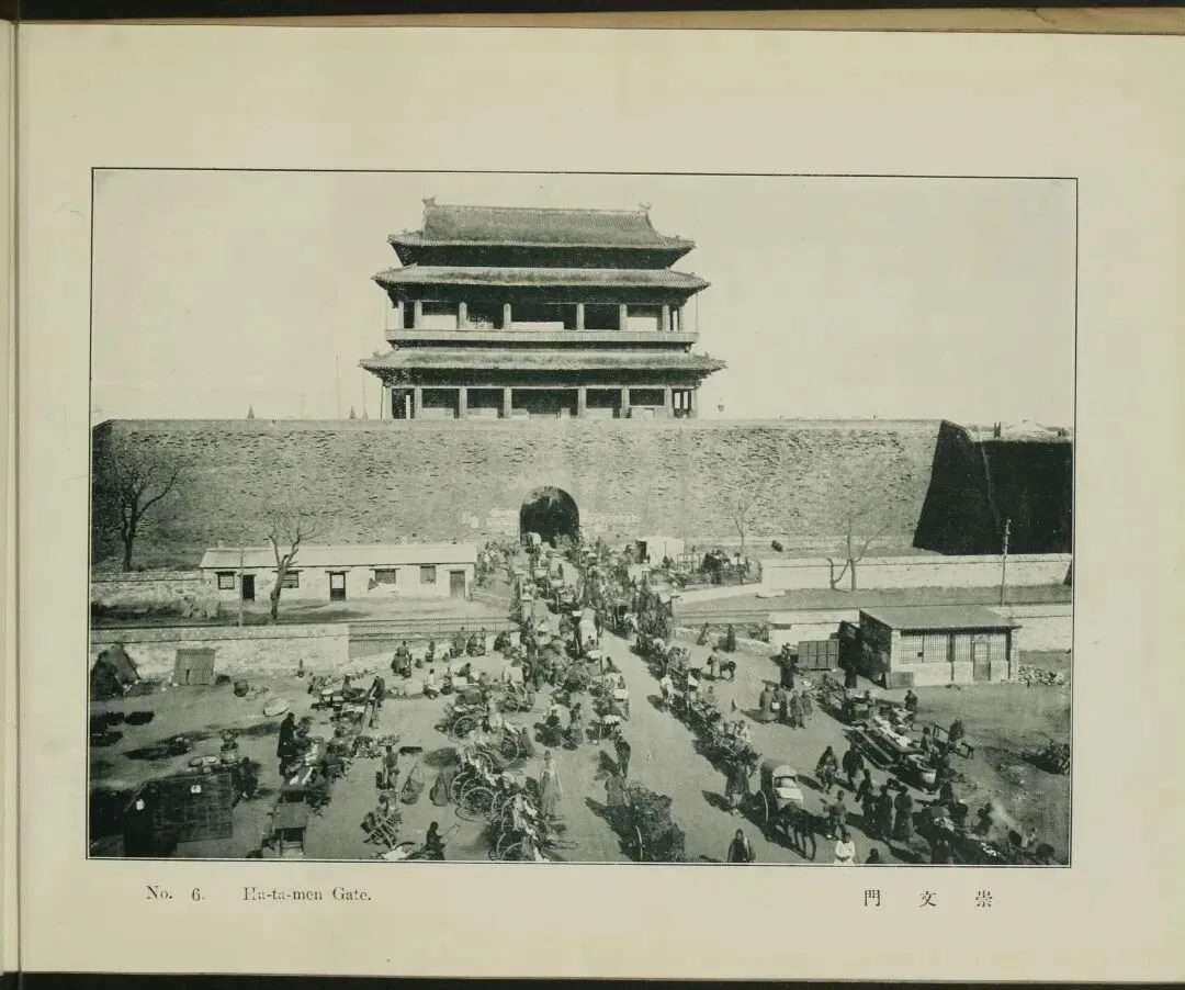 崇文门俗称哈德门,是北京内城南门,是明清时期重要的税关。照片中城门洞下车马行人众多,城门内外商贩、挑夫、行人拥挤在一起,十分热闹。